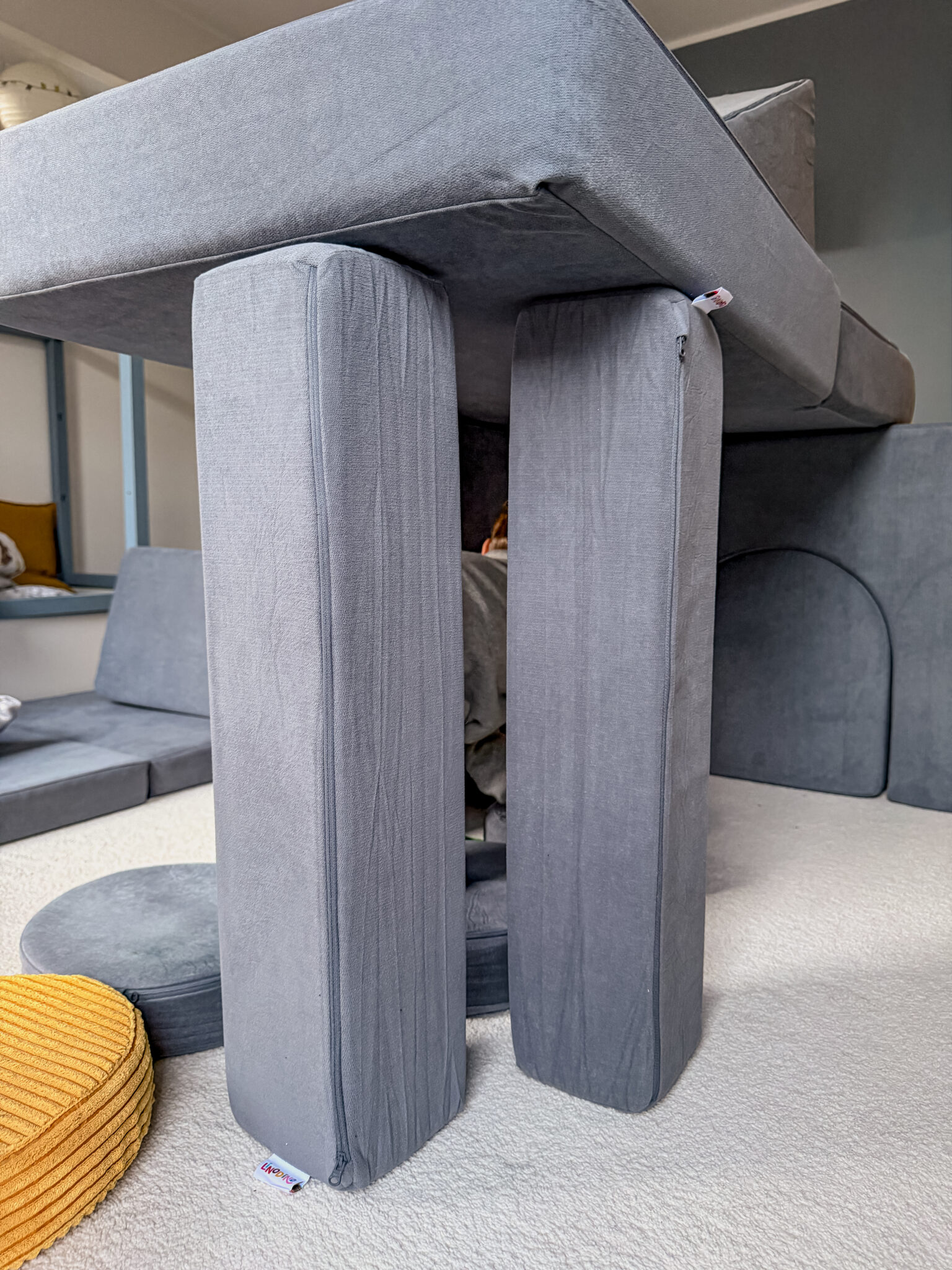 Linodino hat mitgedacht: Die Unterseite ist nicht nur rutschfest (wichtig bei Parkett!), sondern der Reißverschluss ist in einer kleinen „Garage“ versteckt. Das schützt nicht nur neugierige Kinderhände, sondern bewahrt auch deinen Fußboden vor fiesen Kratzern